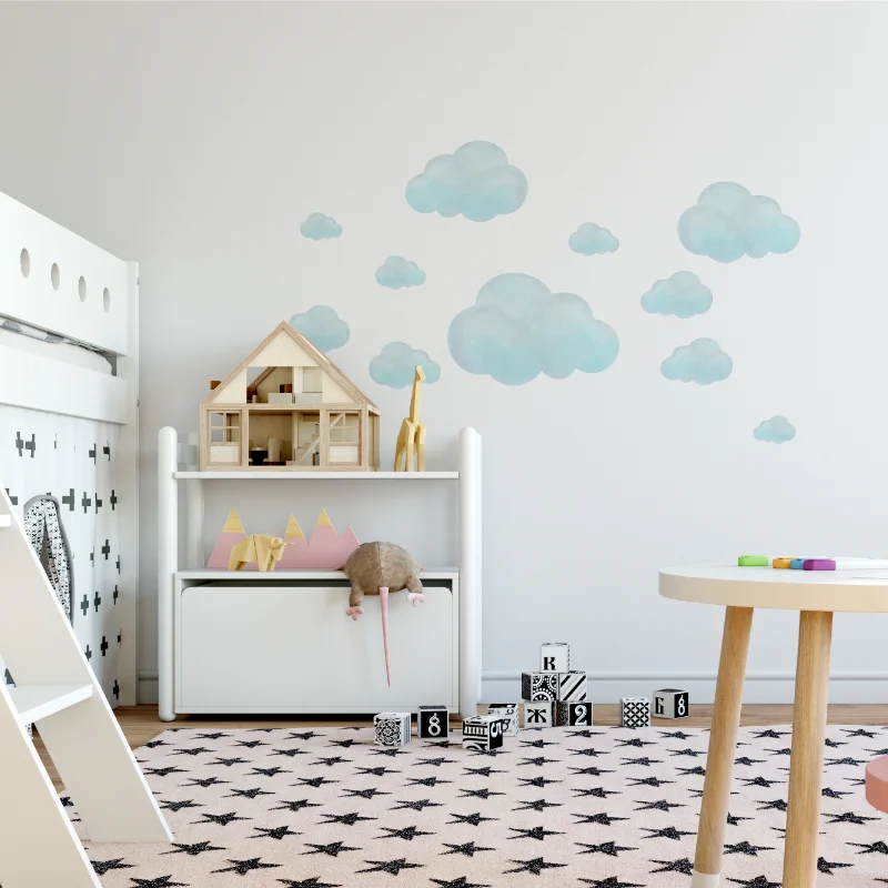 Zestaw 11 niebieskich chmurek w różnych rozmiarach, do samodzielnej aranżacji.Chmurki mają delikatne szare refleksy. Wspólnie z dzieckiem zaplanuj projekt ściany i baw się naklejaniem.