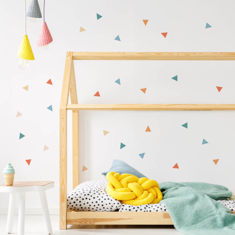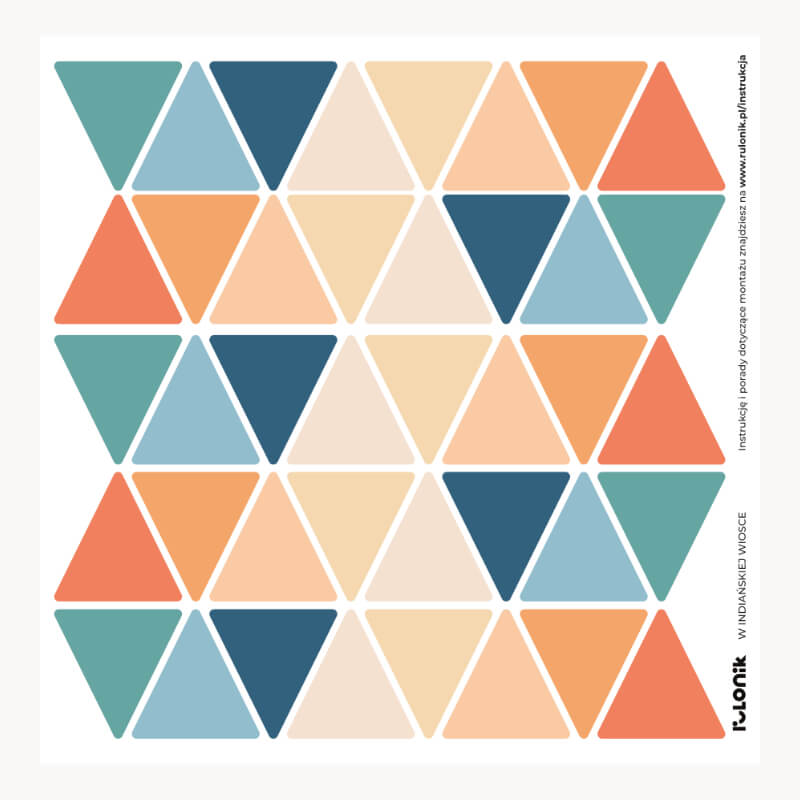 Zestaw zawiera 40 kolorowych trójkątów w ośmiu różnych kolorach. Naklejki umieszczone są na arkuszu o wymiarach 30 cm na 30 cm. Wysokość jednego trójkąta wynosi 5 cm.