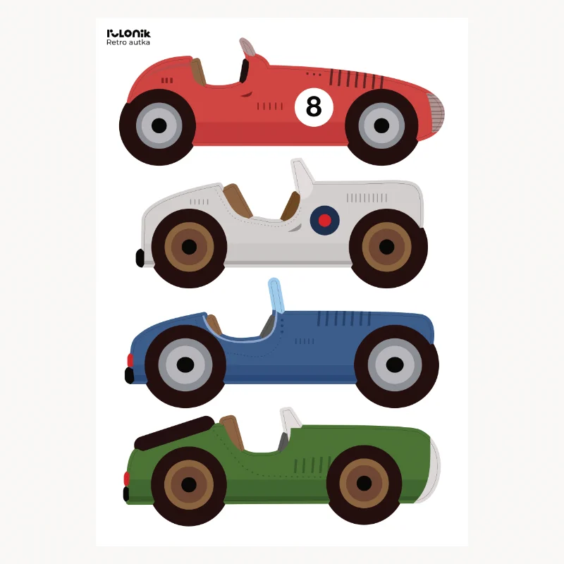 Dekoracja świetnie sprawdzi się przy ozdabianiu ścian, mebli i drzwi. Retro autka to idealna propozycja dla młodych fanów motoryzacji.
