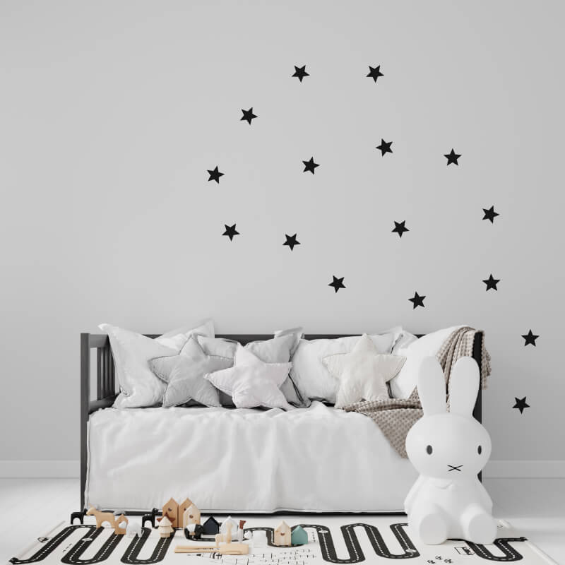 Gwiazdka w domu tuż na wyciągnięcie ręki. Urocze małe gwiazdki odmienią pokój Twojego dziecka nie do poznania. Zestaw naklejek 16 gwiazdek do samodzielnej aranżacji - małe czy duże konstelacje, rozproszone czy też regularnie rozłożone - tylko od Ciebie zależy układ naklejek, wspólnie z dzieckiem zaprojektuj ścianę i baw się naklejaniem. Dekoracja świetnie sprawdzi się przy ozdabianiu ścian, mebli i drzwi.