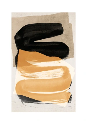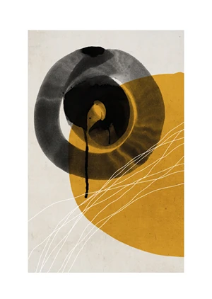 Minimalistyczny plakat z fantazyjnymi, czarnymi kształtami na białym tle.