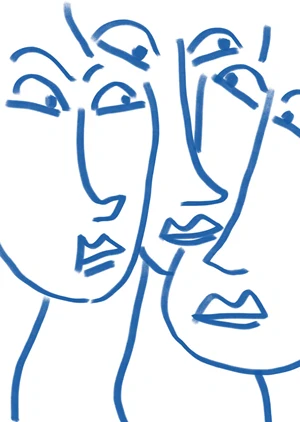 Minimalistyczny plakat przedstawiający niebieską postać inspirowany twórczością Henriego Matissea.