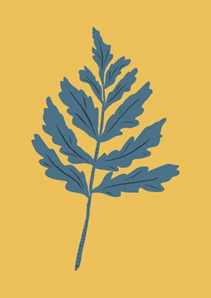 Minimalistyczny plakat przedstawiający miętowego liścia na turkusowym tle.