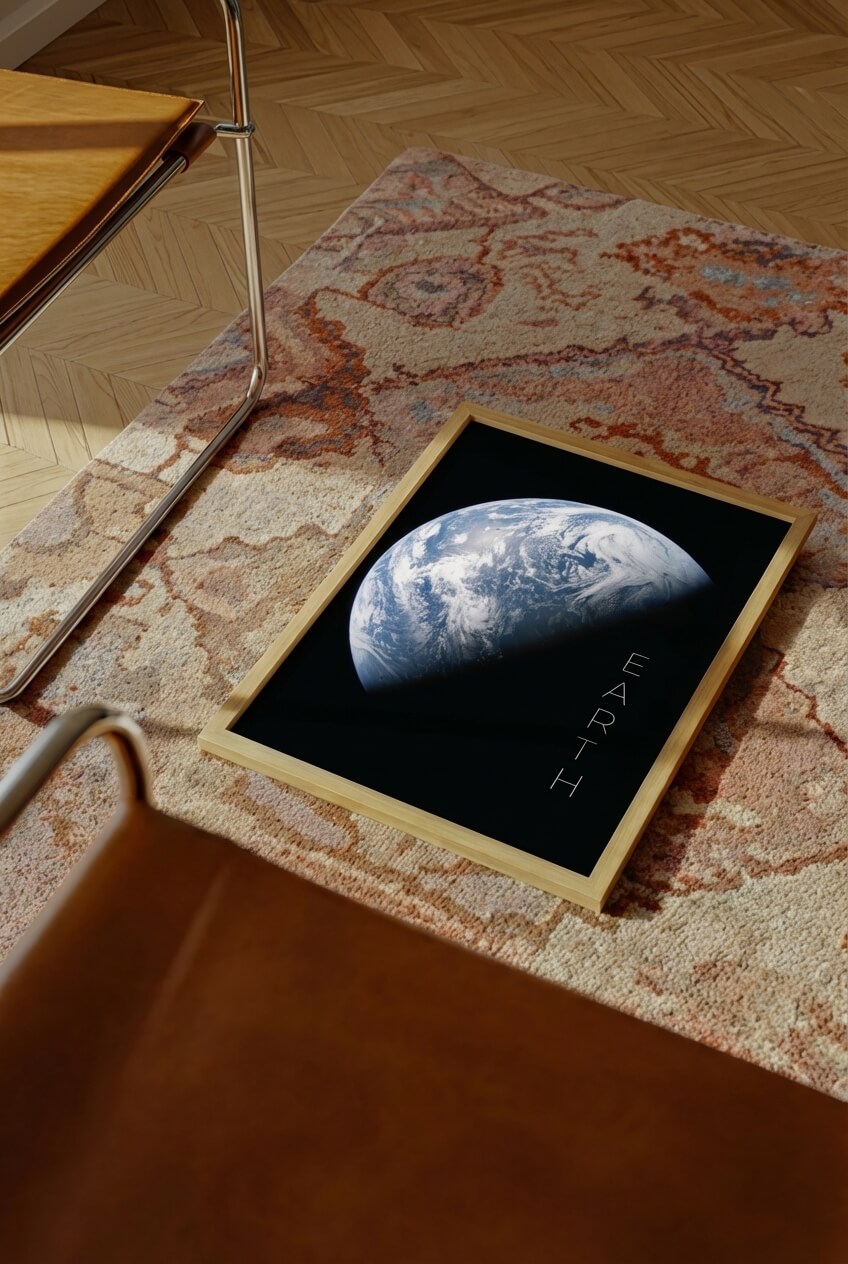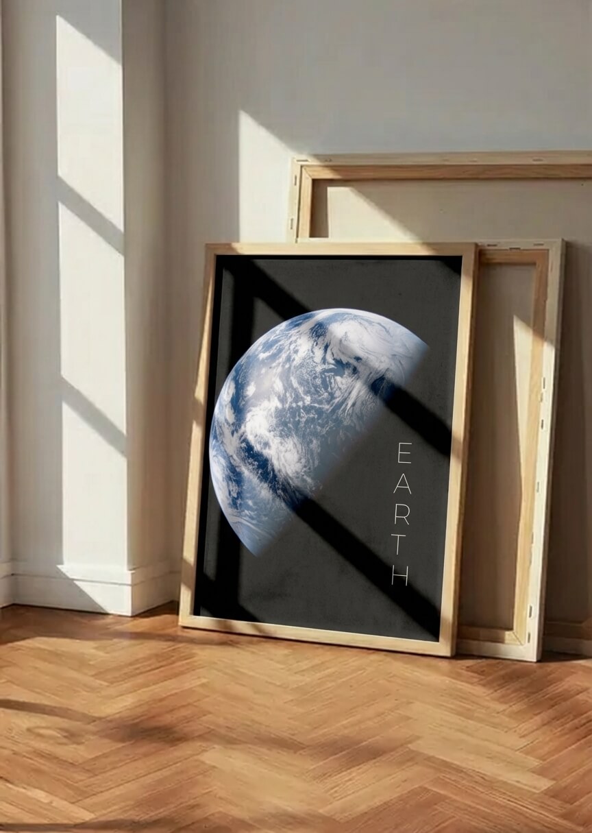 Minimalistyczny plakat z widokiem Ziemia wyłaniającej się z mroku — symbol spokoju, przestrzeni i nieskończoności. Zdjęcie pochodzi z misji NASA.